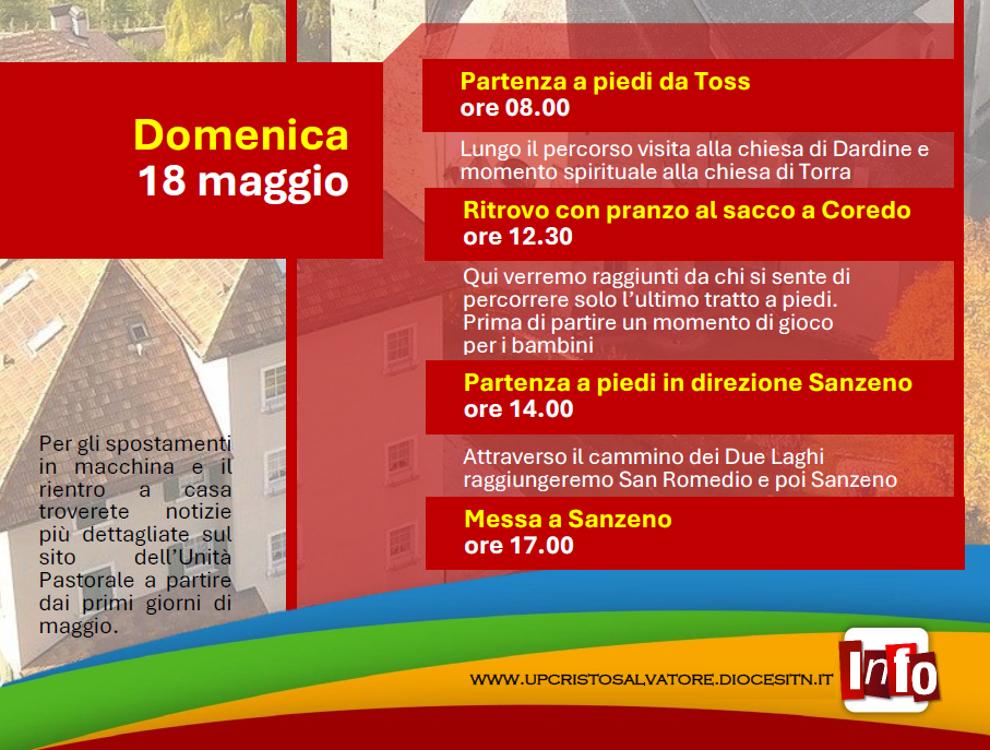 • Per il rientro dei pellegrini partiti da Toss è disponibile al termine della messa un bus da prenotare gratuitamente entro mercoledì 14 maggio che accompagna fino in piazza a Toss. Di seguito il link per la prenotazione