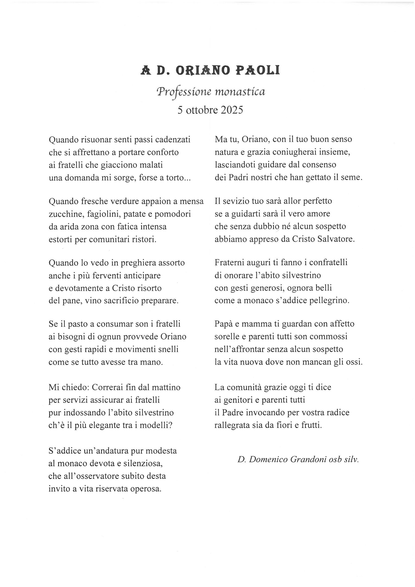 Preghiamo per Oriano, perché possa andare avanti, credendo, sperando, amando sempre di più. Che il Signore ti conservi il gusto appassionato del mondo, insieme ad una grande apertura di Cuore e ti aiuti ad essere umano fino alla fine. La Vergine Madre, i Santi Padri Benedetto e Silvestro, ti aiutino a dire ogni giorno il tuo “fiat” al Signore, con la sua stessa prontezza e radicalità. Che tu possa dire ogni momento insieme a S. Paolo: “Non sono io che vivo, ma Cristo che vive in me”. Amen.
